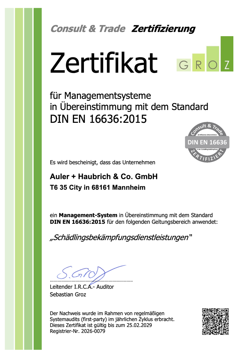 Die DIN EN 16636:2015 ist eine europaweit anerkannte Norm, die Anforderungen an professionelle Schädlingsbekämpfungsdienstleistungen definiert. Sie legt besonderen Wert auf strukturierte Abläufe, fachliche Qualifikation, Risikobewertung, Präventionsmaßnahmen sowie eine nachvollziehbare Dokumentation aller Prozesse.